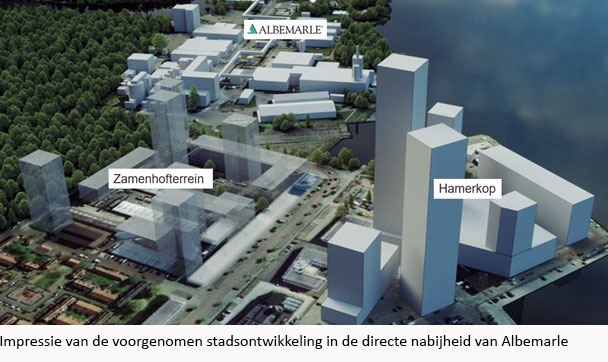Op 7 juli j.l. heeft Albemarle een zienswijze ingediend bij de gemeente Amsterdam als reactie op de voorgenomen ontwikkelingsplannen van het Hamerkwartier. In deze zienswijze zet Albemarle uiteen dat ondermeer het MER onvoldoende zorgvuldig is opgesteld en derhalve leidt tot verkeerde conclusies over de mogelijkheden tot ontwikkeling van het Hamerkwartier. De situatie waarin wonen en industrie dermate dichtbij elkaar worden gerealiseerd vereist veel zorgvuldigheid en overleg met betrokken partijen. Albemarle staat een goede relatie voor met de gemeente en de huidige en toekomstige bewoners en maakt zich zorgen over de geconstateerde onzorgvuldigheiden en de gevolgen voor de leefbaarheid in het Hamerkwartier, de beleving van toekomstige bewoners nabij Albemarle en de bestaande en toekomstige bedrijfsvoering van Albemarle. Albemarle staat open voor een constructieve dialoog met de gemeente en hoopt dat de gemeente haar verantwoordelijkheid neemt voor het welzijn van haar toekomstige bewoners in het Hamerkwartier, die nu nog geen stem hebben.